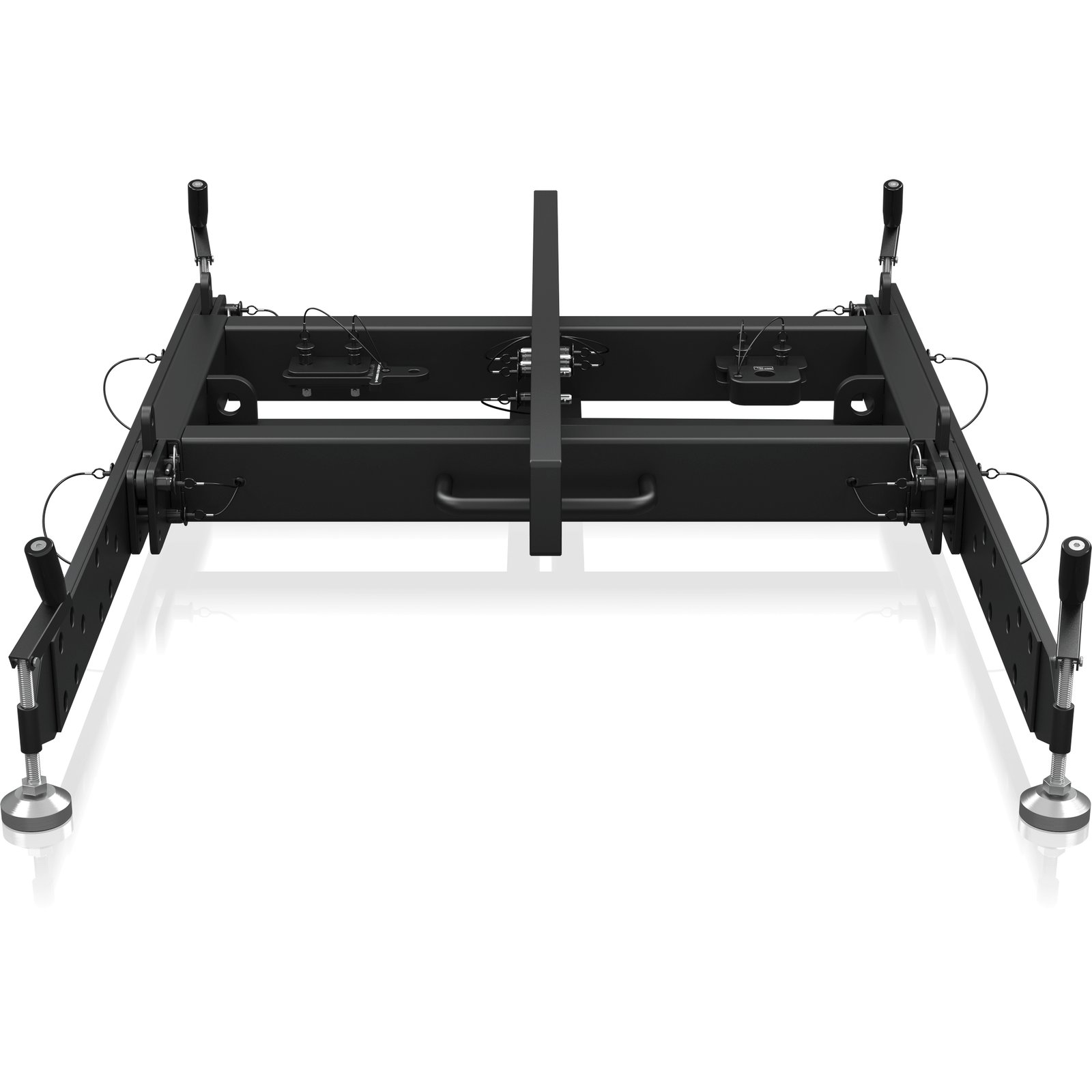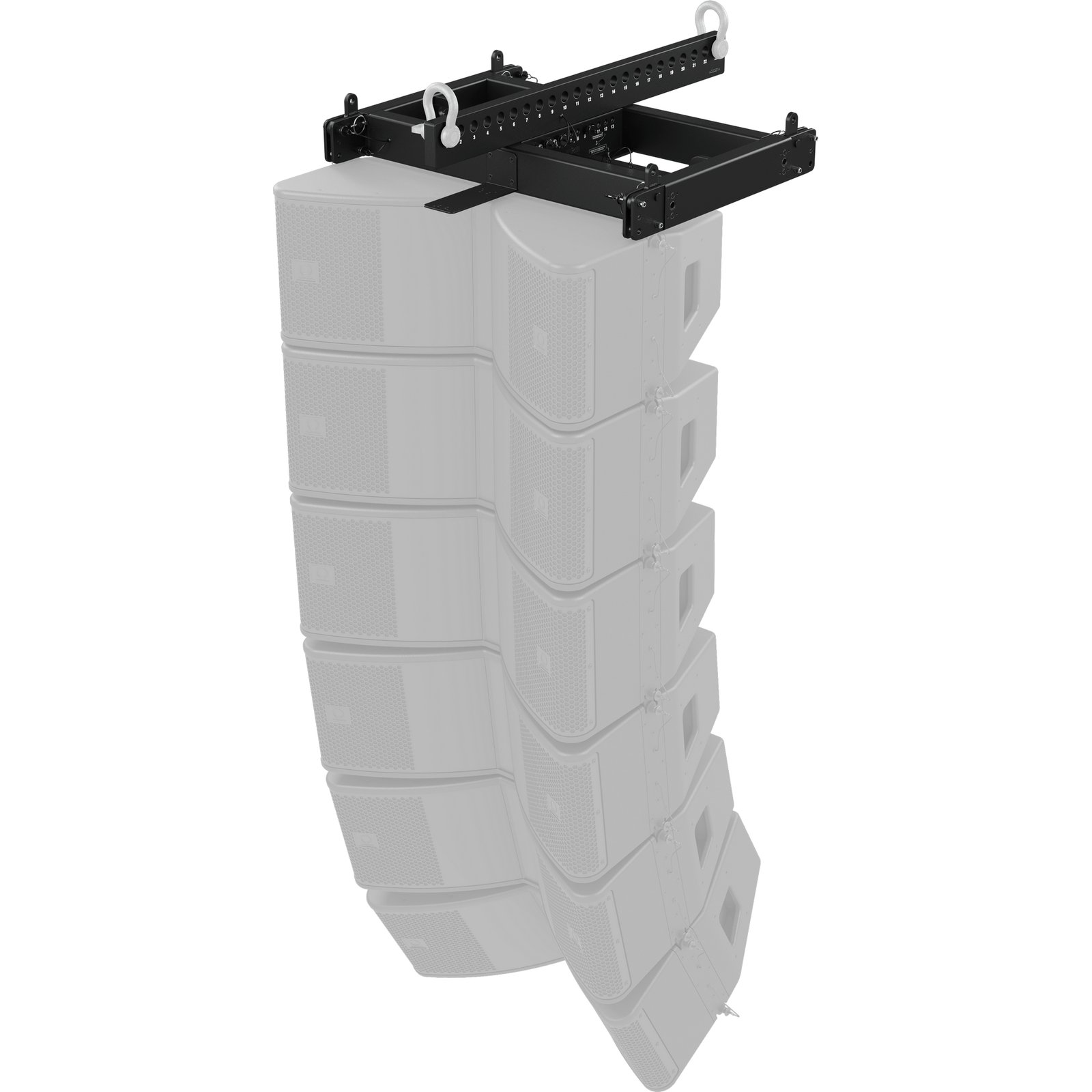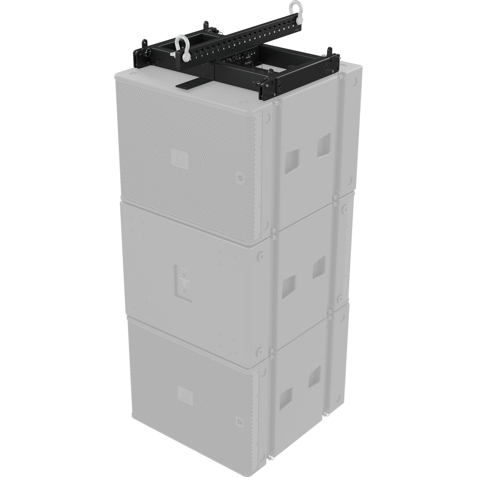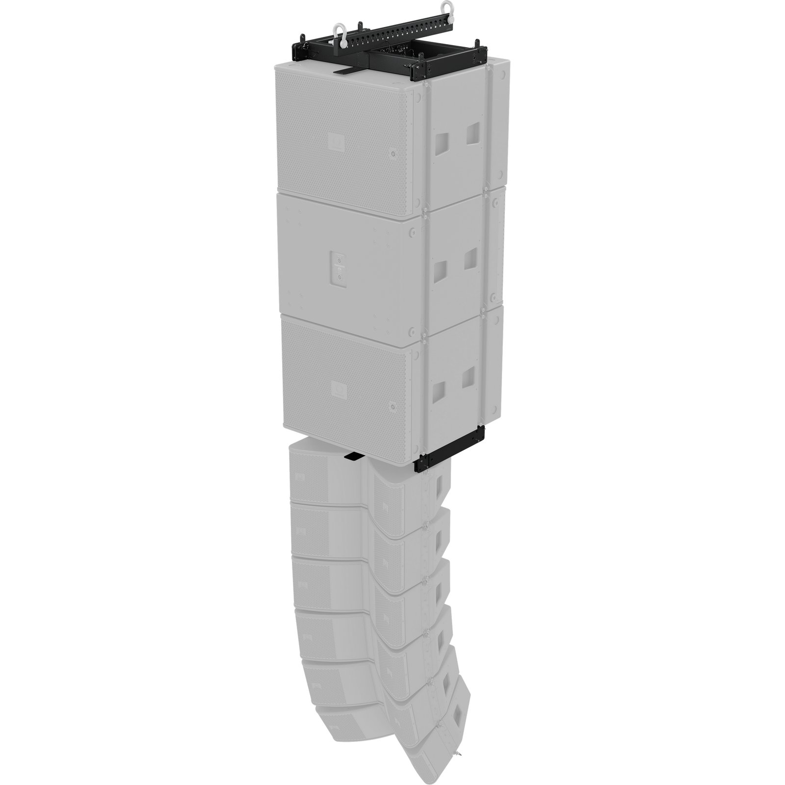 The MAN210-FG fly grid is designed to safely suspend unique or mixed arrays of MV210-HC line array elements and MS121 subwoofers. Engineered to meet BGV-C1 specifications, the fly grid can suspend multiple line array elements or subwoofers in unique arrays guarded by the WLL. The fly grid is secured to the uppermost speaker enclosure using the supplied drop links and rigging pins, with additional enclosures attaching in a similar manner below in succession. For suspension of mixed arrays, a second MAN210-FG is used to couple MV210-HC elements to the MS121 subwoofer above.